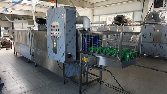 Continuous washing machine for crates E1, E2, and M10 , featuring a rinse with clean water and a cold air blow-off